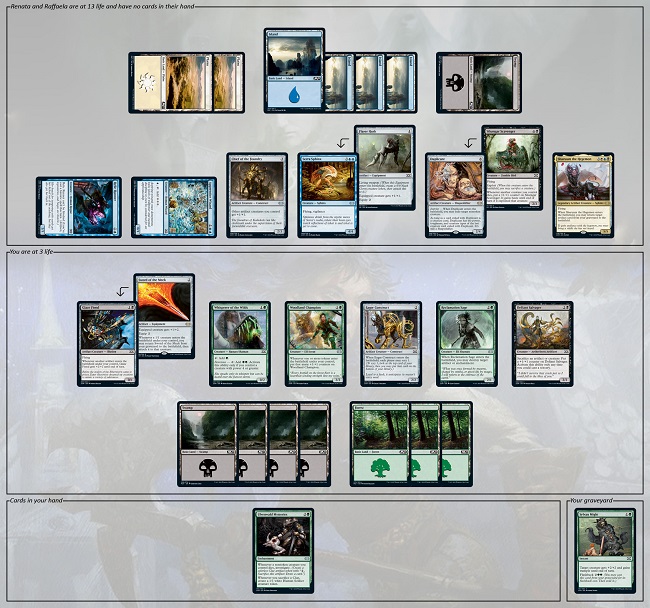 Renata suddenly taps two lands and aims a Revoke Existence at your Golem Artisan. You grunt in frustration, realizing that that's going to take out half of your air defenses.