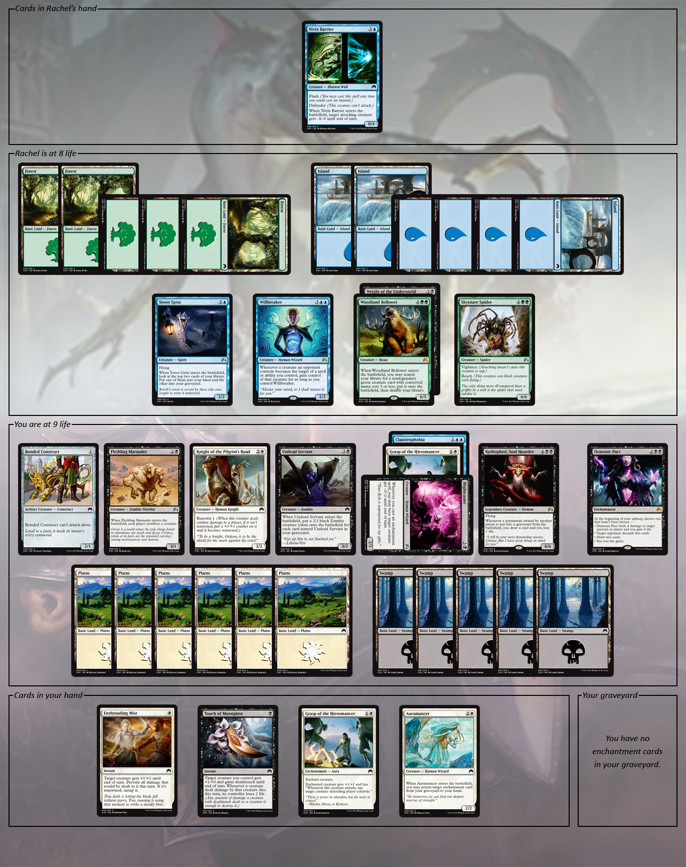 - Blightcaster (tapped, with your Grasp of the Hieromancer and Rachel’s Claustrophobia attached)