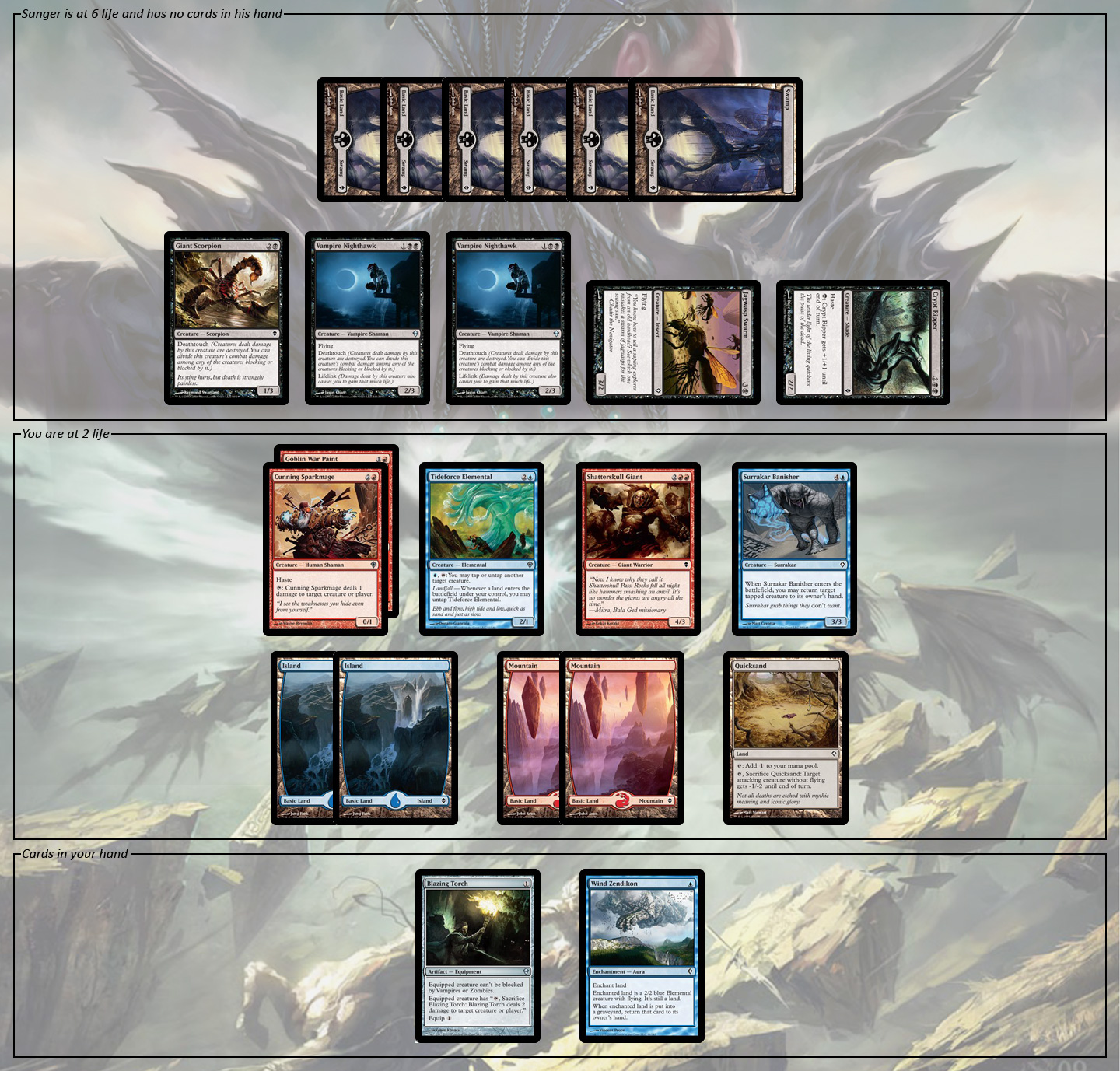 Sanger is at 6 life and has no cards in his hand. He has the following cards in play: