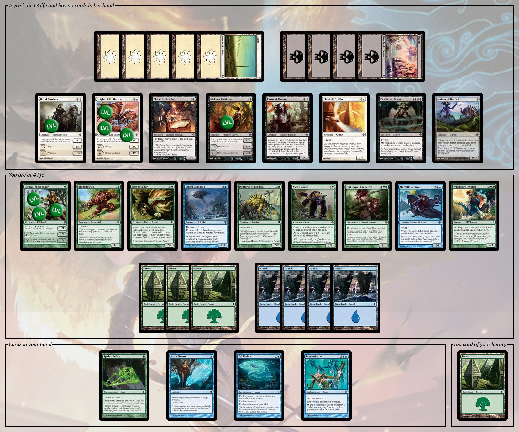 As any casual observer can see, your board is a mess. Having played several levelers as well as the mana to ramp them up, Joyce has superior creature quality (as well as a comfortable lead in life totals). You, however, have the advantage in cards and resources—and neither of you has been able to break through the other’s defenses . . . yet.