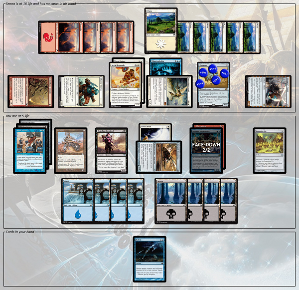 On his last turn, Senna drops a Sluggishness on your face-down creature and taps an Intimidator Initiate to crew his Smuggler’s Copter.Then he attacks you with 5 power worth of flyers (six, considering his Infantry Veteran) to bring you one turn away from death. Even worse, his Copter draw gives him a Pentavus, which he plays on his second main phase.