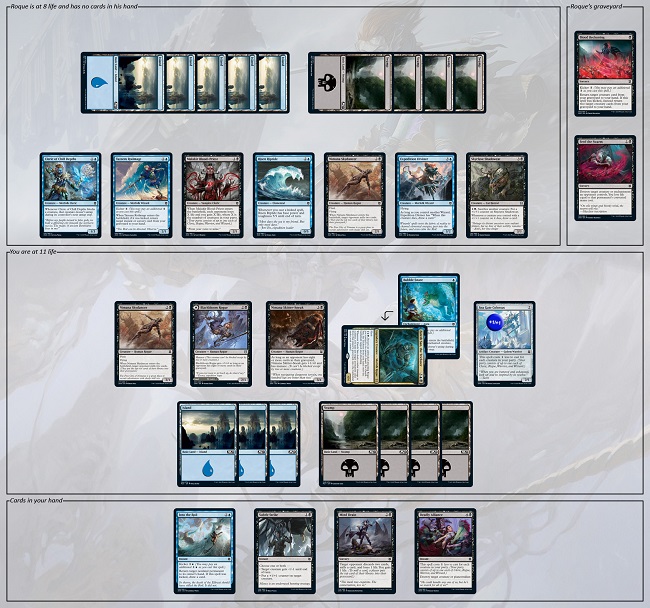 Roque is at 8 life and has no cards in his hand (although he still has a good number of cards remaining in his library). He has the following cards in play: