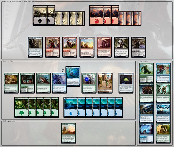 Gordon is at 11 life and has no cards in his hand. He has the following cards in play: