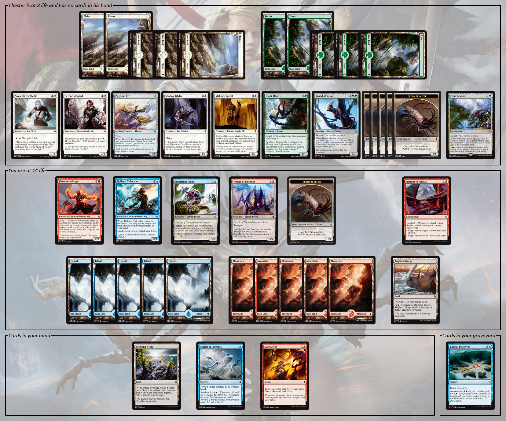 Chester is at 8 life and has no cards in his hand. He has the following cards in play: