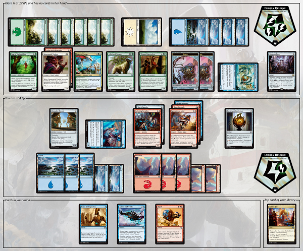 You wonder how Kiara has gotten this far without winning any matches: Her deck is a slow one, but she does have a couple of legitimate late-game threats. After using a nasty Dynavolt Tower / Empyreal Voyager combo to cut down most of your creatures, you managed to draw a Consulate Skygate to stem the bleeding. At that point, however, she drew and played a Gearseeker Serpent . . . and you have no easy solutions for the 5/6.