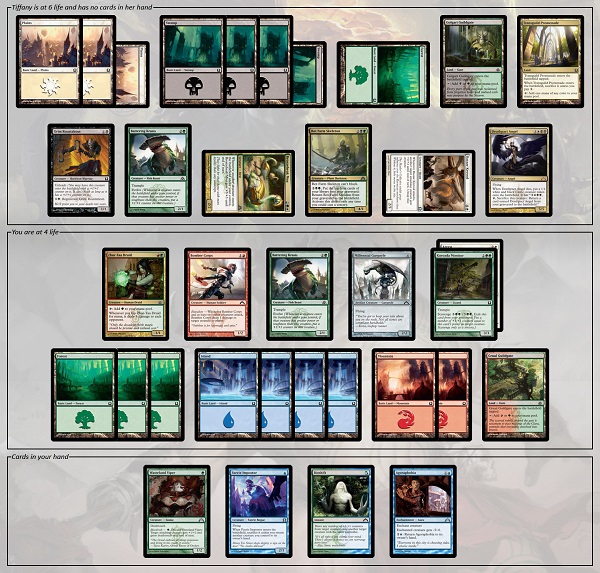 Tiffany is at 6 life and has no cards in her hand. She has the following cards in play: