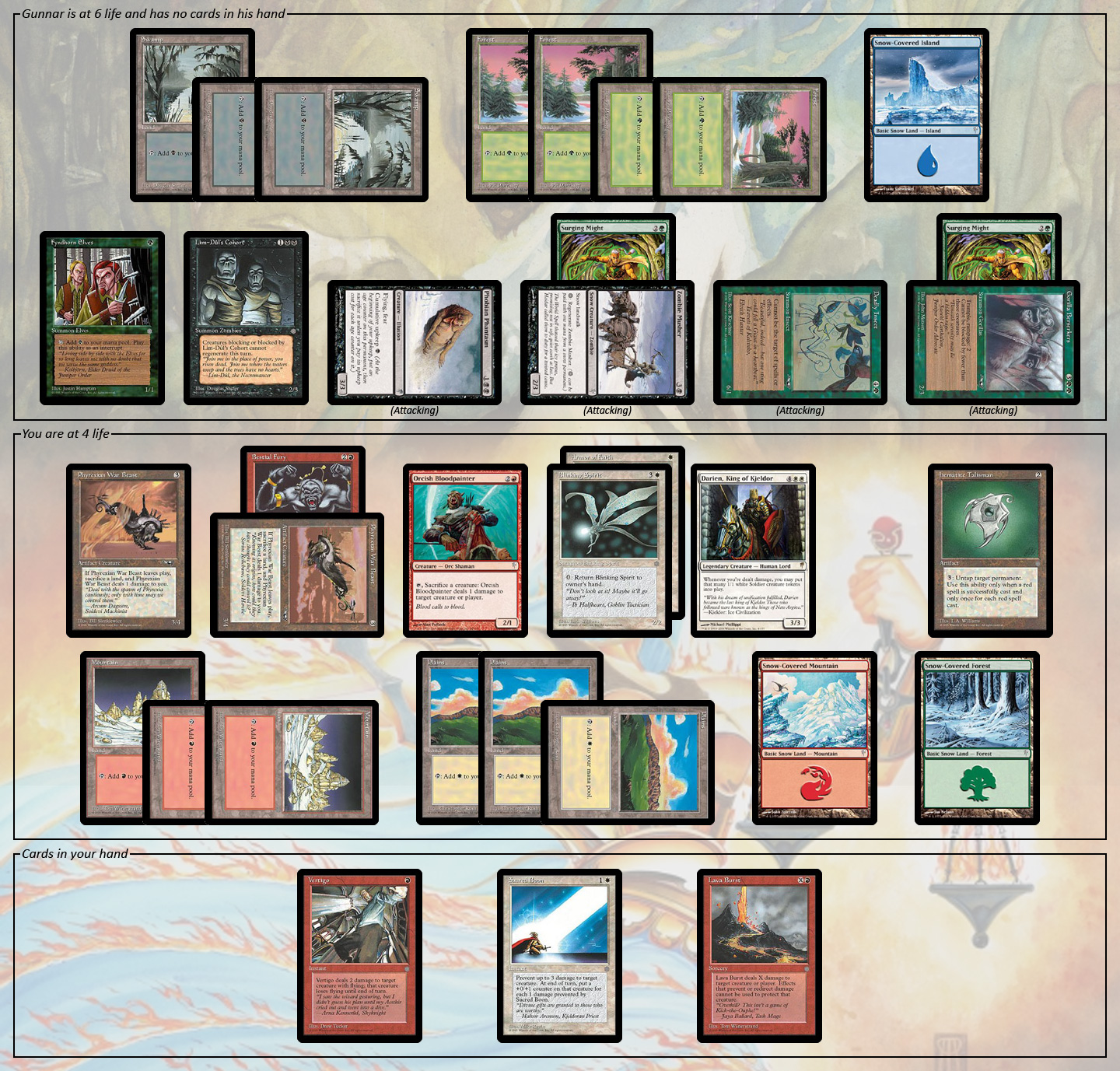 On your previous turn, you decided to take a chance: You played Bestial Fury on one of your two Phyrexian War Beasts and then attacked with the enchanted 3/4 artifact creature. When Gunnar declined to block it and took the 3 damage instead, your plan became clear: You assume he’s going to attack with his Phobian Phantasm on his turn, in which case you’ll cast Vertigo on it, untap your tapped War Beast as a surprise blocker, and take down the big black flyer (as well as any other attackers he might have).
