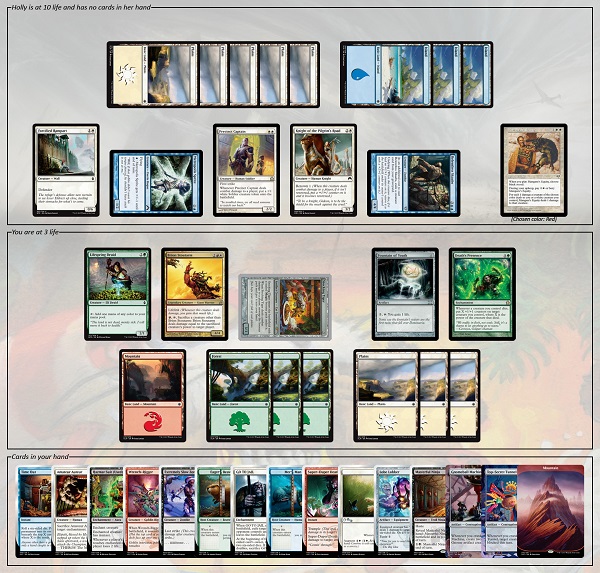 Holly is at 10 life and has no cards in her hand. She has the following cards in play: