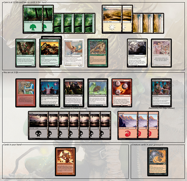 After Cam’s attack on her turn, she calmly recasts her Sylvan Ranger, searches for a Forest and plays it, then casts the Weatherseed Treefolk she drew. With a 3/5 flyer and two tramplers in play on her side, you’re not sure which one’s going to kill you first. But you do know that you have one turn to find a way out of this hopeless situation.