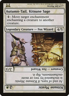 Now you have a new creature in play, named Autumn-Tail, Kitsune Sage. This creature is Legendary, a 4/5, and has an activated ability for one generic mana that allows you to move auras from one creature to another. These flip cards acted very much like transforming double-faced cards behave today, but back in the early 2000's Wizards of the Coast was still hesitant to print anything other than the standard Magic back on the backside of a card. This rotational flipping was their solution back in Kamigawa block.