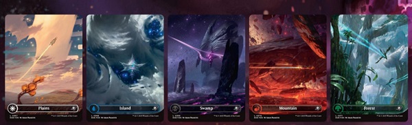 Obviously they're uniquely different. If someone went back in time, however, and swapped one set for the other, would anyone blink an eye or question their fit within either set? I'd argue not. In fact, I'd argue that if Wizards of the Coast used the planet basic land artwork from Unfinity as the borderless basic lands in Edge of Eternities, no one would have questioned the decision. The overlap is that strong.