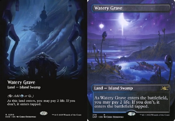 They don't look exactly the same, but you have to admit there are similarities in lighting and tone. Also, at least in the case of Watery Grave, the same artist illustrated both the full-frame Unfinity version and the full-frame Edge of Eternities version of the card! Coincidence? Or subtle reference to the Un-set? Only Chris Ostrowski knows for sure if Unfinity had any influence on the Edge of Eternities version.