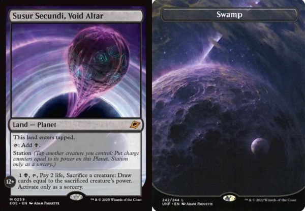 If you disagree with this comparison, I'd challenge you to ask Adam Paouette. They're the brilliant artist who illustrated both Unfinity's planet version of Swamp and Edge of Eternity's Susur Secundi, Void Altar. I really think Wizards of the Coast was going for a semi-serious twist on Unfinity's flavor when they created this set. The common artists illustrating similar cards supports this theory.