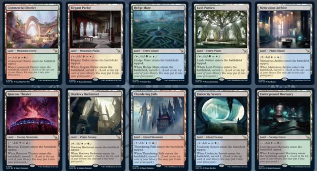 That's right, Murders at Karlov Manor contains a full set of ten ally and enemy colored Surveil Lands, some of which are the most valuable cards in the set!