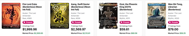 In addition to borderless cards, it looks like there are highly collectible, highly valuable neon ink foil versions of some cards in the set. Fire Lord Zuko and Aang, Swift Savior with this special finish has sold for north of $2000 already. There's also a version of Toph, the First Metalbender that will likely fetch a price in the same range.