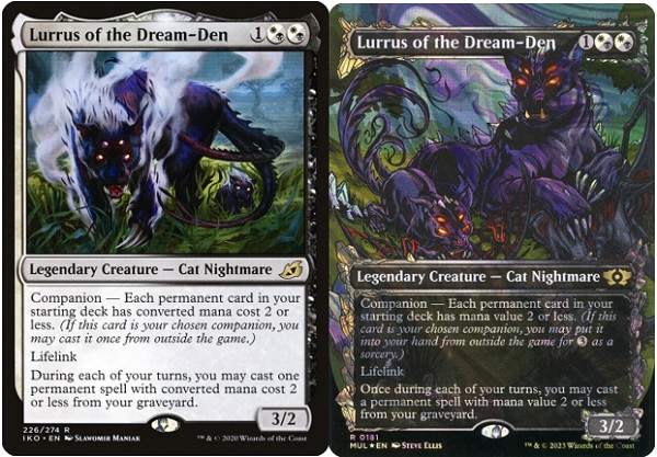 Below are before and after pictures of Lurrus of the Dream-Den; the former is the original from Ikoria, and the latter is the Multiverse Legends reprint. Can you spot the difference in the rules text?