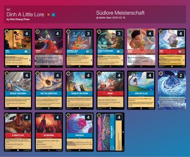 Battle-Bear hosted a 222 player event in Germany this past weekend, showing you that even during a lame duck session, Lorcana events continue to draw in large pools of competitive Illumineers. Interestingly enough, Dinh Khang Pham, better known as DKP, took down the event with, you guessed it, Ruby Sapphire. He faced a well-known competitor, Jan Moy, in what I could only imagine as a grueling mirror match in the finals, where DKP claimed victory. Below is his list: