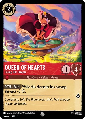 Queen of Hearts - Losing Her Temper is a 2-cost, ink-able character that has great stats when damaged. A potential 4 strength, 4 willpower character that can check aggro-style decks is nothing to scoff at. In a world where she can potentially still be around when Belle - Accomplished Mystic is played, you can take up to 3 damage that was dealt to her, and send it right over to an opponent's character, giving you even more options to keep her around for value trades. Self-damage decks are still unexplored in Disney Lorcana, and I'm excited to see what's in store for this card during the early meta for Archazia's Island.