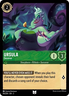 Ursula is a really strong card that gives you the opportunity to remove songs from your opponent's hand. This gives you a lot of information early on, which is why we've included 4 for consistency. When played properly, this character can be an absolute menace to.