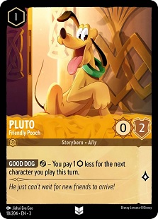 Since we already have 3 copies, it made sense to add the 4th to complete the playset. You will be playing a lot of characters in this deck so being able to play them at a discount is extremely beneficial. Pluto - Determined Defender can shift on to Friendly Pooch for 5 ink, making it a bit harder to challenge your other characters thanks to Bodyguard.