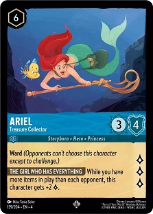 We couldn't have a set focused on Ursula without Ariel, right? And boy, do we have an extremely strong one to talk about. Ariel - Treasure Collector is a 6-cost uninkable character that can quest for up to 5 lore, given that you have more items in play than your opponent. Given that Sapphire is well known for items, this should not be difficult to pull off. She has Ward, which helps prevent her from being targeted. This makes her an ideal target for Lucky Dime since you'll only need to quest with her to close out the game. I've seen her end up in more Ruby/Sapphire and Steel/Sapphire decks, and it totally makes sense why.