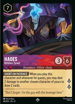 Why it Makes the Cut: Hades is here to ensure your hand never stays empty. Drawing two cards is a powerful effect, and being able to trigger it upon playing him and each time he quests provides a consistent stream of resources. The cost of dealing 2 damage to one of your own characters is a strategic decision - perhaps targeting a character with high willpower or one that has an ability when damaged. In longer games, this Hades can be the key to out-valuing your opponent.