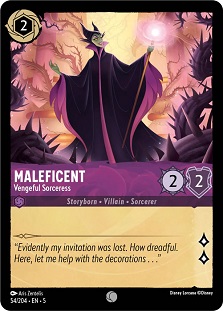 It's clear the designers for this set want to support a Maleficent tribal deck. With Constructed format, it's hard to leverage a wide board of Maleficent characters while also getting to 8 ink without the support of Sapphire to help. The good thing is that there's two Maleficent characters in Sapphire as well, from The First Chapter. If that's the direction you want to head in. Shifting her onto another Maleficent seems counter-intuitive as well.
