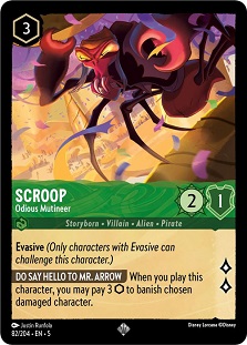 Scroop also fits well with damage-based decks and for an additional 3 ink when played, you can outright banish a damaged character. With Evasive, he'll stick around to quest for a bit too, proving to be a valuable character in the mid-to-late game.