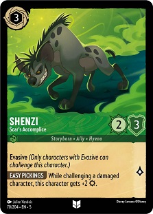 Shenzi is one of the Hyenas introduced in this set. Being a 3-cost inkable character that can potentially turn into 4 Strength when attacking damaged characters and has the Evasive keyword is pretty solid. If hyenas do take off, I do see this being a staple in the deck. Otherwise, I don't see it making the cut for the current competitive decks.