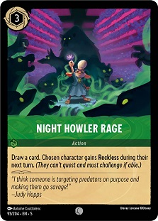 Night Howler Rage seems to do well in Emerald-based decks that punish your opponent for challenging your characters. With it's additional cantrip to draw, I can see this in decks playing Cursed Merfolk - Ursula's Handiwork, Flynn Rider - Charming Rogue, and Lyle Tiberius Rourke - Cunning Mercenary.