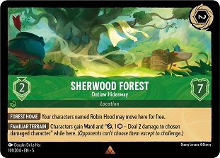As if Robin Hood didn't get enough love, he got his own location too. The additional activated ability granted by this location on characters allows you to use targeted damage to deal with finishing off the last bit of Willpower left on characters or characters that won't exert. Also granting Ward is a nice kicker as well.