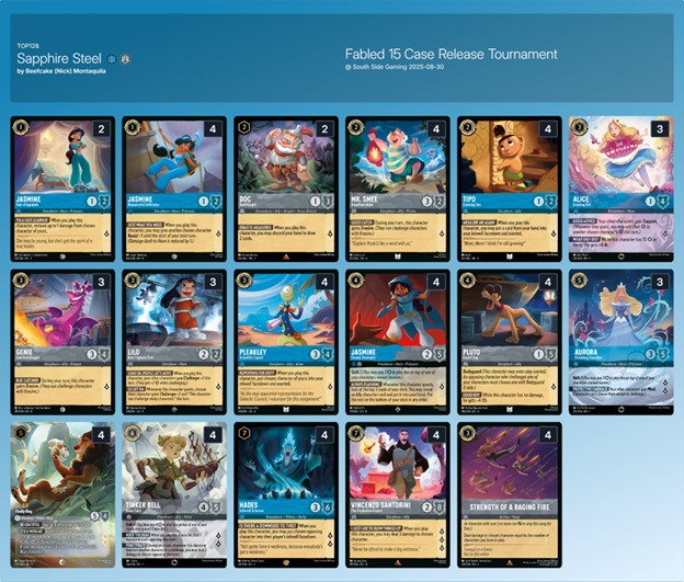 Looking for the best Sapphire Steel decks in Disney Lorcana's new Fabled meta? You're in the right place. This quick guide gives you two week-0 shells you can sleeve up tonight, plus how to pilot them against what people are actually playing. Core Constructed now uses sets 5 to 9, and Fabled adds key reprints that keep Sapphire Steel very real at the top tables. (Lorcana.gg)