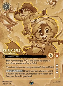 Chip 'N' Dale - Recovery Rangers follows the theme of previous Floodborn characters, such as Flotsam and Jetsam in which there are multiple shift targets to use. This helps bring down the play cost to 5 ink, which seems like it's almost required to get the full effect of this card once it hits the board. Its other effect, Search and Rescue, is a new thematic mechanic that triggers each time you place a card in your inkwell. We'll probably see some deck-builders try to maximize this effect by pairing this with Sapphire to recur character cards back to your hand from the discard pile. At 8 ink with 6 strength, 6 willpower, and 3 lore pips, we're looking at some decent stats at 8. Being uninkable makes it a bit difficult to consider this if you're already high on uninkables, but I do think decks focused on the inkwell trigger effects will try to find a way to bring more value to this card.