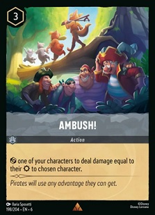 Ambush brings a mechanic that I feel is unexplored in Lorcana. This calls back to Magic: The Gathering's First Strike ability, allowing you to keep a character on the board with no reduction of damage if your strength meets or exceeds the defending creature's toughness. In this case, we actually get to target the character instead and deal with threats that are either readied or have Evasive. Not having to challenge also allows you to keep board pressure through character presence, which is always a plus.