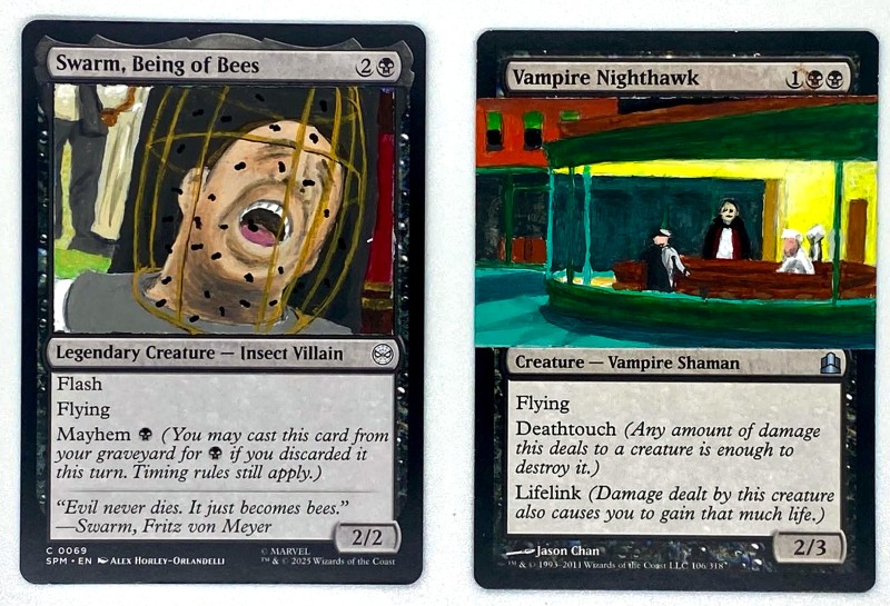 Swarm, Being of Bees, altered with the Nicholas Cage "Wicker Man" meme is more than enough reason to put this list together in paper. I also decided to alter a Vampire Nighthawk as a Vampire in Edward Hopper's famous painting "Nighthawks." I don't think I'm a great alterist by any stretch of the imagination, but I'll only get better by keeping at it. These alters are just that - fun excuses to paint a few more cards, challenge my abilities, and have a little fun. I might build Swarm in paper, and I may someday even sell them. Either way, I'm happy to share them with you here, and hopefully you found them amusing.