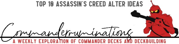 Today's column is going to be my personal top 10 Assassins from Assassin's Creed and how I would alter them, if I was going to take on such a project. I tried to pair each card with an Assassin from popular culture. When I'm actually altering cards I start out with a digital mockup, which I print out and then transfer the basic design of the new art onto a primed card so that I can get the look just right. These images aren't that far from an early step in my normal process of altering cards.