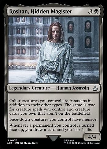 Face down cards in a deck built around Assassins are much spookier than facing a bunch of manifest or morph cards and there is no better commander for this kind of deck than Roshan, Hidden Magister. This legendary Human Assassin turns all of your creatures into Assassins and gives your face-down creatures menace. When you turn a permanent you control face up, you'll draw a card and lose 1 life. This legendary creature needs to be in a deck where you'll be able to play cards face down, but if you're willing to be in mono-black, I think Roshan's card draw could be a real boon for a deck like this.
