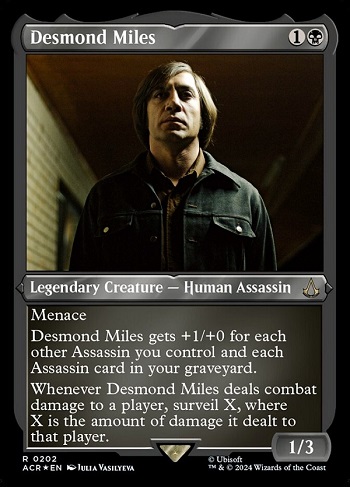 Desmond Miles has menace and gets +1/+0 for each other Assassin either under my control or in my graveyard. Whenever he deals combat damage to a player, I'll surveil X where X is the amount of damage he dealt to that player. Desmond Miles and many of the other cards in this list want to be in a deck with lots of other assassins.