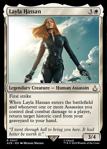 Layla Hassan is a rare Assassin in white. She's got first strike and she'll let you recur historic cards from your graveyard to your hand when one or more Assassins you control deal combat damage to a player.