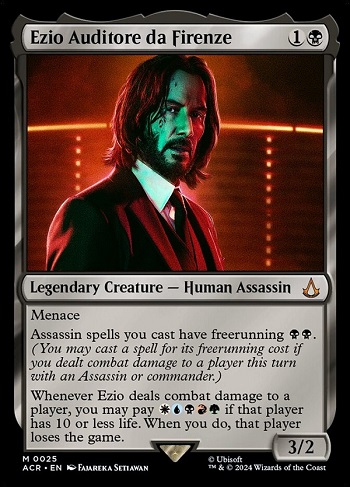 I'm not sure if Ezio is one of the most important characters in Assassin's Creed, but he has Menace, gives your Assassin spells freerunning, and puts us in five colors with a fantastic final ability. That makes me think me must be pretty important. That final ability is that whenever he deals combat damage to a player, you may pay five and if that player has 10 or less life, they'll lose the game. That's more impactful in 20 life formats than in commander, but it is still pretty cool.