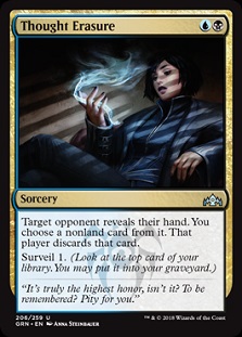 counterspell with surveil 1. Thought Erasure is a bit of hand hate. This sorcery costs UB and lets you have an opponent reveal their hand. You get to force that player to discard the card of your choice and then you surveil 1.