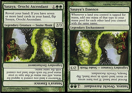 Sasaya is a weird card, possibly even weirder than Multani. She starts out as a legendary Snake Monk. At any point in time you can reveal your hand and if you have seven or more land cards in your hand, you get to flip Sasaya, Orochi Ascendant. When you flip Sasaya she turns into a Legendary Enchantment called Sasaya's Essence. When Sasaya's Essence is on the field your lands tap for extra mana. They add one mana of the type they normally create for each other land you control with the same name.