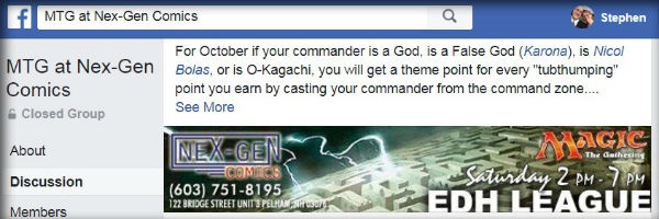 Every morning I post an announcement about what's going on at the LGS that our league plays at. Some nights NexGen Comics hosts Magic Drafts, some nights it's Modern, some nights it's Standard and on Saturdays I get to post about our Commander League.