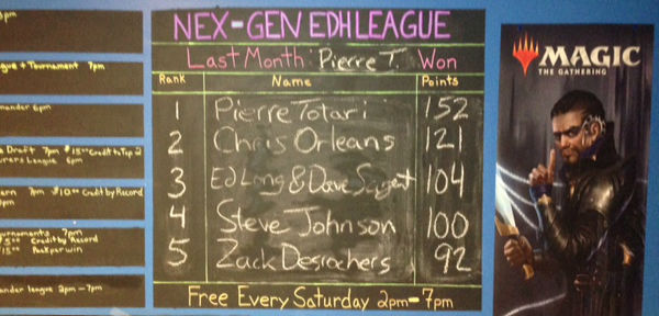 The Saturday morning Facebook post always includes basic info like when, where, and how much our Commander League is, and I always mention what our monthly theme happens to be. I also do a little "horse race" commentary, congratulating the previous month's winner and mentioning who is at the top of our current month's rankings.
