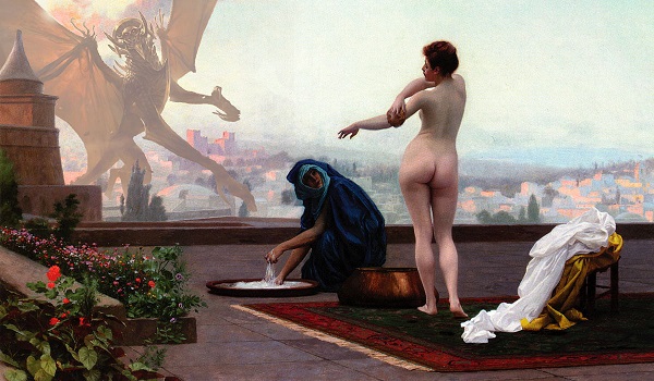 The insertion of this particular version of Arch-Fiend of Ifnir provided me with a perfect character in the middle of a perfect reaction. There he is, doing his best Godzilla impersonation, wrecking an ancient city when he turns and sees a beautiful lady having a sponge bath in the middle of the day. If I can interpret a Demon's body language I wouldn't say he's gawking or leering as much as he's just surprised and a little taken aback. The speech or thought bubble over his head might read "Hey now!" or "Hello there!" although he is a Demon so he might just as easily be sizing up his next snack.