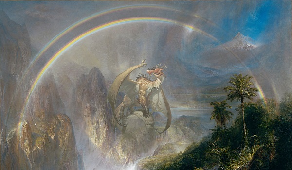 When I went through my Dragons phase I knew I wanted to put Oros, the Avenger into a painting but it took me a while to realize that this gorgeous double rainbow landscape was the right fit.