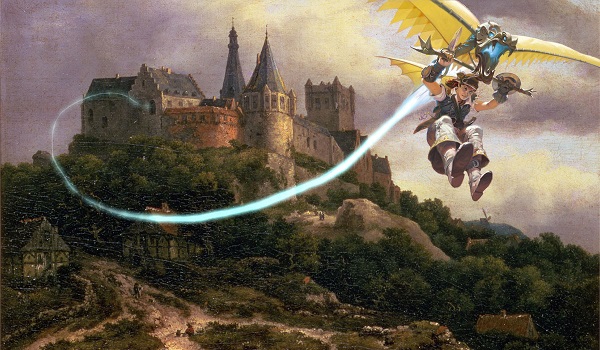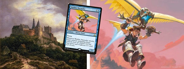 The Warkite Marauder is a wonderful figure, but it lacks context. Our hang-gliding Marauder is sailing through the skies, but where are they going and where did they come from? I tried to answer that question by pairing the card art up with a painting of The Castle of Bentheim by Jacob Van Ruisdael from the 1650s.