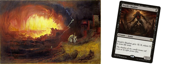 Death's Shadow is a card that sees fringe play in EDH in decks like The Mimeoplasm but isn't a mainstay of our format. I decided to take The Destruction of Sodom and Gomorrah by John Martin (1852) and use it for the background. I removed the two figures in the foreground and split the figure on the card from the monstrous shadow creature behind him.
