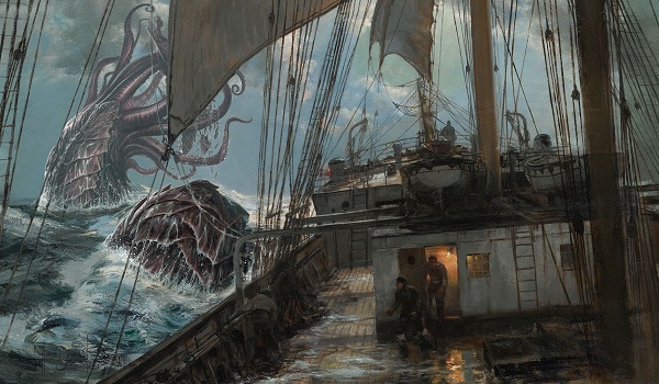 The new picture tells a very different story. Our Stormtide Leviathan is about to swallow a ship whole. I wound up really happy with the way it feels like it fits into the background like it was always part of the painting. Now we know what has been wrecking all those ships...