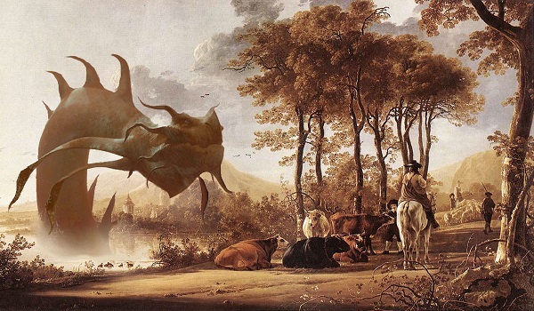 While I had a fairly long series of Dragon inspired pieces, I also had a short set of mashups in 2017 that were inspired by sea monsters. Stormtide Leviathan might not seem like the most inspiring piece of artwork, and Seascape in the Morning by Simon de Vlieger from the early 1640s might not seem like a particularly inspiring painting, but sometimes the sum ends up being greater than the parts. I think this is one of those cases.